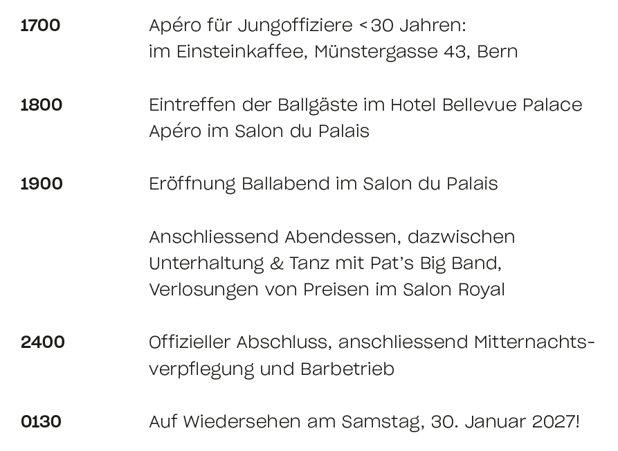 Ball der Offiziere am 31.01.2026 im Hotel Bellevue Palace Bern. Wir freuen uns auf Sie!